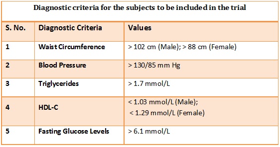 In this randomized, double-blind, placebo-controlled, parallel-group clinical study benefits of curcumin’s lipid modifying activity was evaluated in 100 patients with Met S (according to NCEP-ATPIII criteria). Patients were randomized either to receive Curcuminoids-Piperine combination (1000 mg-10 mg/day) or matching placebo for 8 weeks. The subjects included in the clinical trial fulfilled the following diagnostic criteria as summarized the below table.
