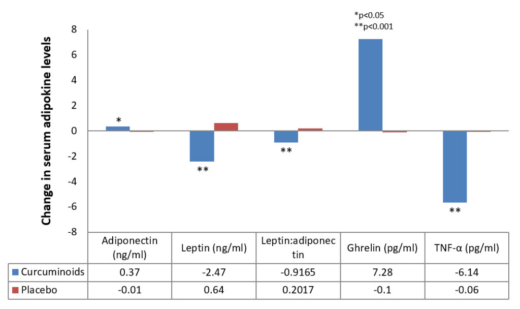 The study suggests the potential of curcuminoids co-administered with piperine to lower inflammatory TNF-α level, and the risk metabolic disorder and cardiovascular diseases by affecting the serum adipokines independent of weight changes. This study once again highlights the immunomodulatory, cardio-protection actions of curcumin among the studied parameters.